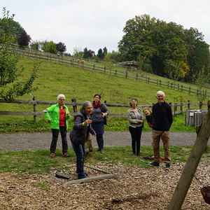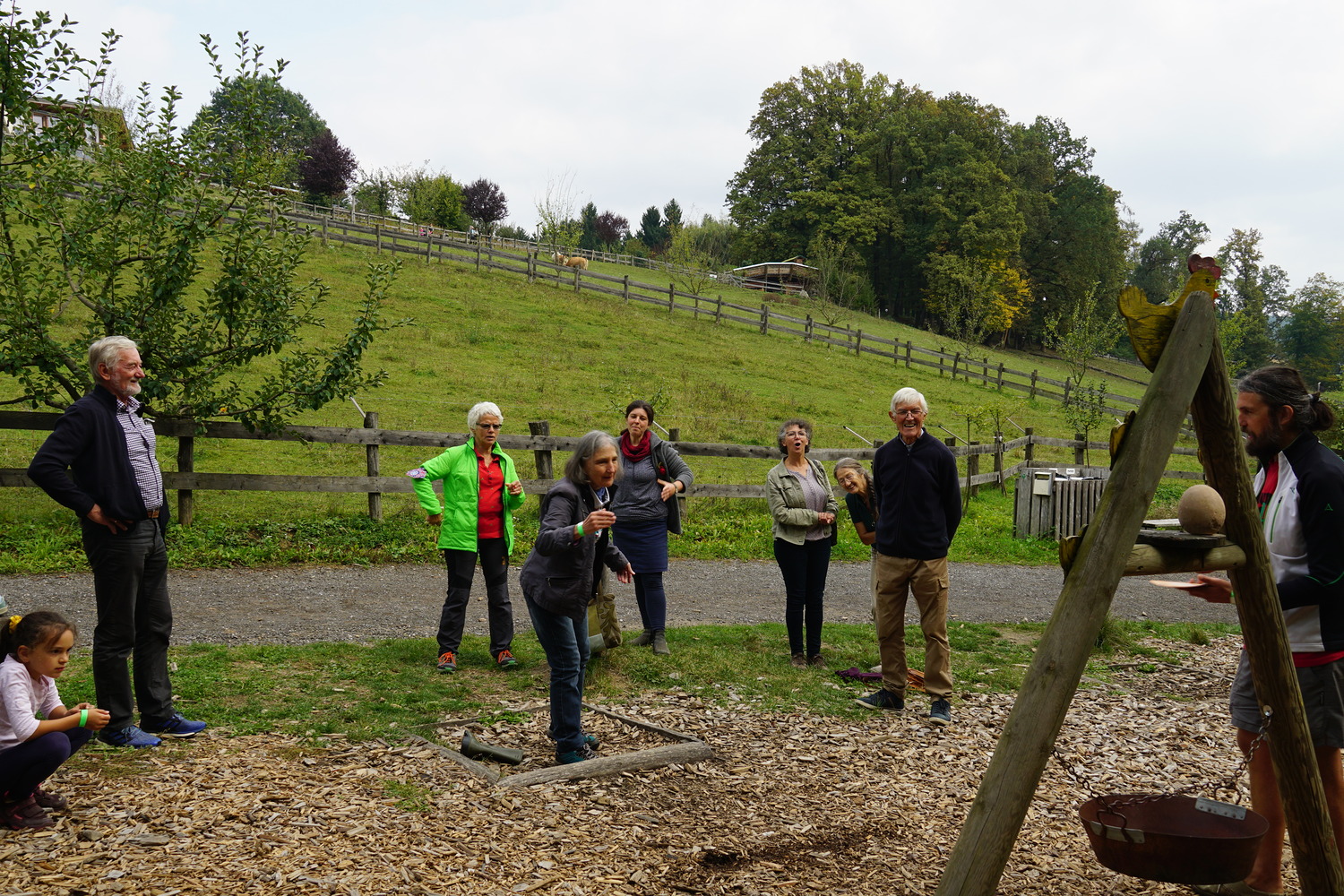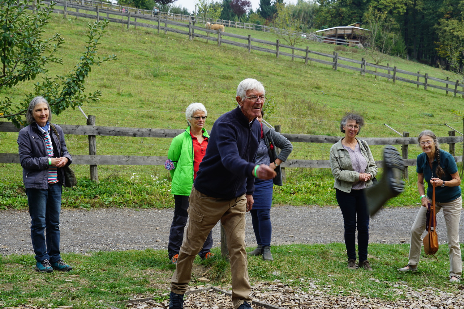 Dann ging es weiter mit einem sehr schmackhaften Bio-Essen in der „Öko-Essbar“ bei Zotter. Als ideale Verdauungsmöglichkeit – und als großes Vergnügen – erwies sich im Anschluss das „Bauerngolfen“. Mit dem gleichen Elan, mit dem der AK Nachhaltigkeit sich um schöpfungsfreundliche Projekte bemüht, wurden auch die Gummistiefel geworfen;-) Vom ältesten Mitglied, Alois Wolkinger, über den ehemaligen KA-Generalsekretär Stefan Kaltenegger bis zur kleinen Elsa waren alle mit Freude dabei.