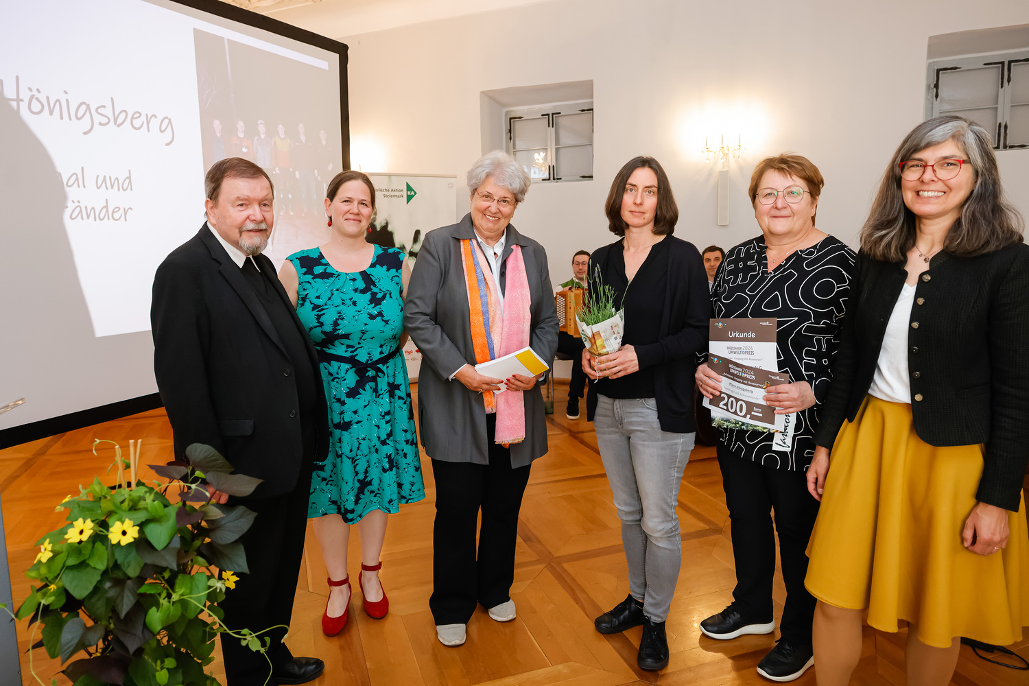 Bereits zum 16. Mal vergab der Arbeitskreis Nachhaltigkeit (AKN) der Katholischen Aktion (KA) den Diözesanen Umweltpreis, der in diesem Jahr unter dem Titel „Achtsamer Umgang mit Ressourcen“ stand. Die Bedeutung der Dankbarkeit gegenüber Gott und der Schöpfung strich Generalvikar Erich Linhardt in seinem Grußwort hervor. Er überreichte die Preise gemeinsam mit der Umweltbeauftragten Eva Heidlmair sowie mit Andreas Gjecaj, Präsident der KA-Steiermark, Martin Halmer, Ökonom der Diözese sowie Anna Kirchengast, Vorstandsmitglied des AKN. Anna Kirchengast stellte in ihrem Grußwort Bezüge zur vor 10 Jahren erschienen Enzyklika Laudato si‘, zur kürzlich durchgeführten Diözesankonferenz und den eingereichten Projekten her – sie alle sind Hoffnungszeichen für eine gute Zukunft.