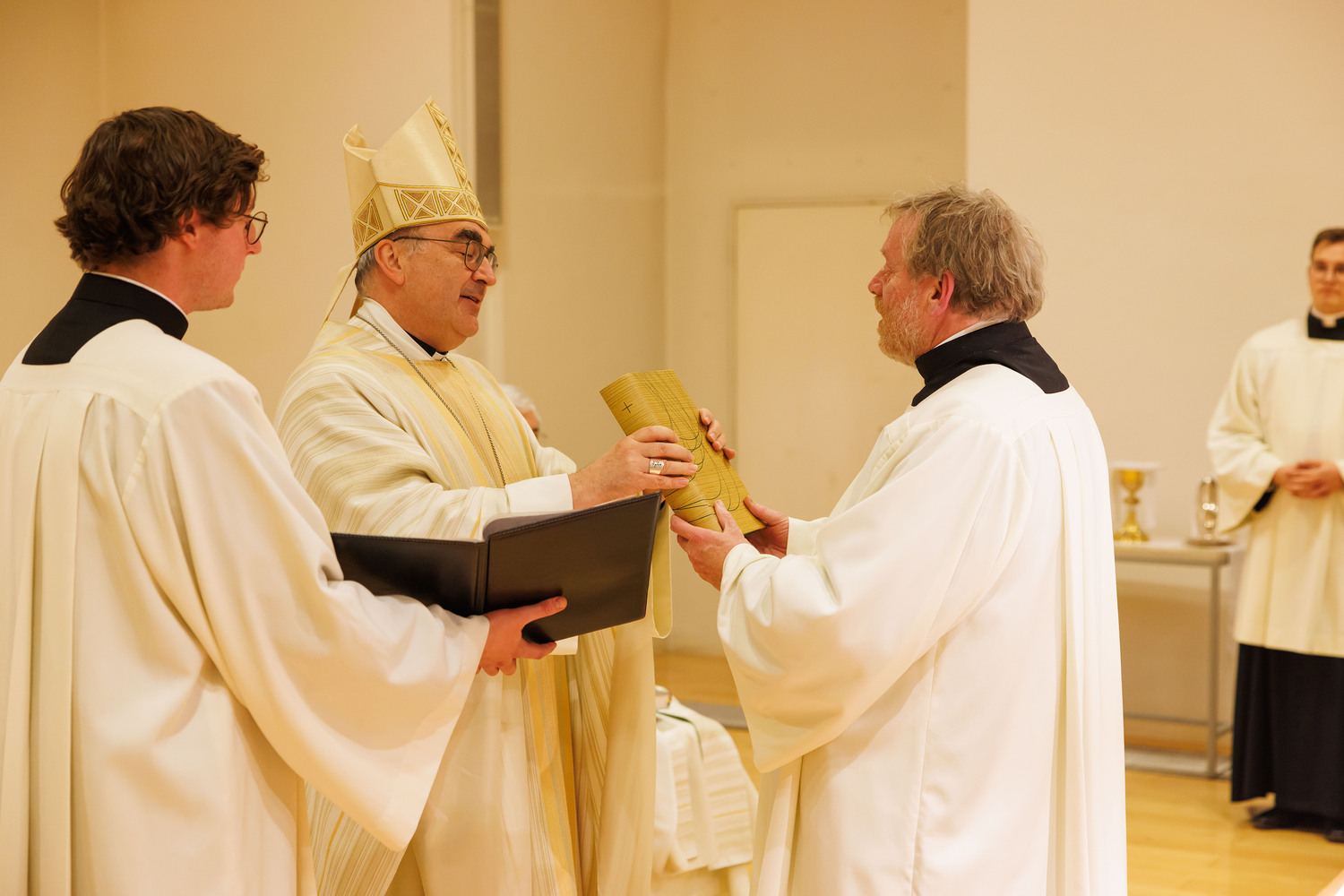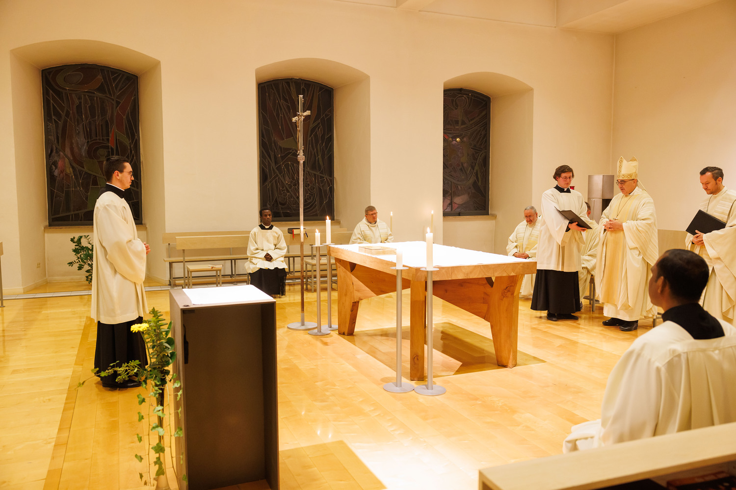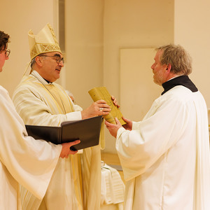 Auf dem Weg der Nachfolge lässt man sich aber immer mehr und mehr in das Lebensgeheimnis Jesu ein. Es sei nicht nur ein Nachahmen, sondern „ein sich selbst in die Fußstapfen Jesu begeben, in dem Seine Lebensart immer mehr zu der eigenen wird.“ Der Bischof wies darauf hin, dass der Maßstab sei, ganz für die Menschen, mit denen man unterwegs ist, zu leben. Sein Wunsch: „Wenn du, Thomas, heute zum Dienst als Akolyth beauftragt wirst, dann ist dies nicht bloß der offizielle Auftrag der Kirche, die Kommunion zu spenden oder liturgische Dienste auszuüben. Es geht um den innersten Kern christlicher Berufung, den zu vertiefen Du Dich auf den Weg gemacht hast. Lass möglichst viele daran teilhaben!“