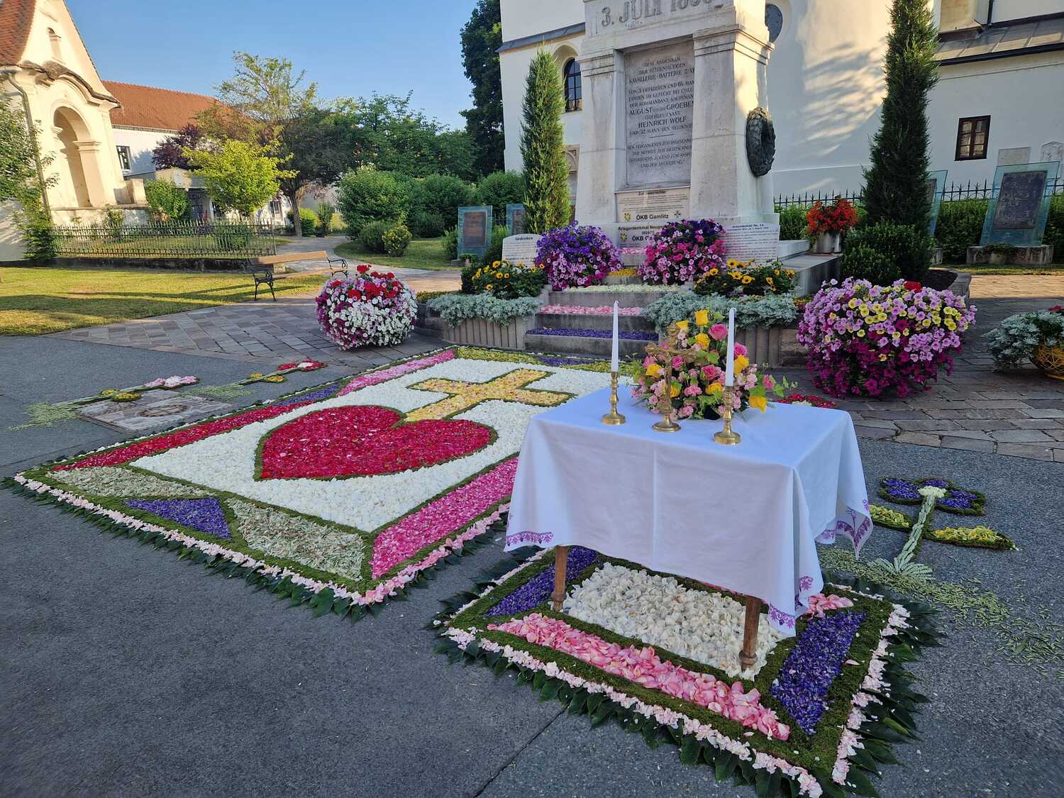 An Fronleichnam feiert die katholische Kirche, dass Jesus in geweihtem Brot und Wein auch nach seinem Tod gegenwärtig ist. Vielerorts finden Prozessionen statt, Kinder streuen dabei Blüten auf dem Weg und an den Feldstationen werden wunderschöne Blütenbilder vorbereitet. So auch bei uns in Gamlitz...