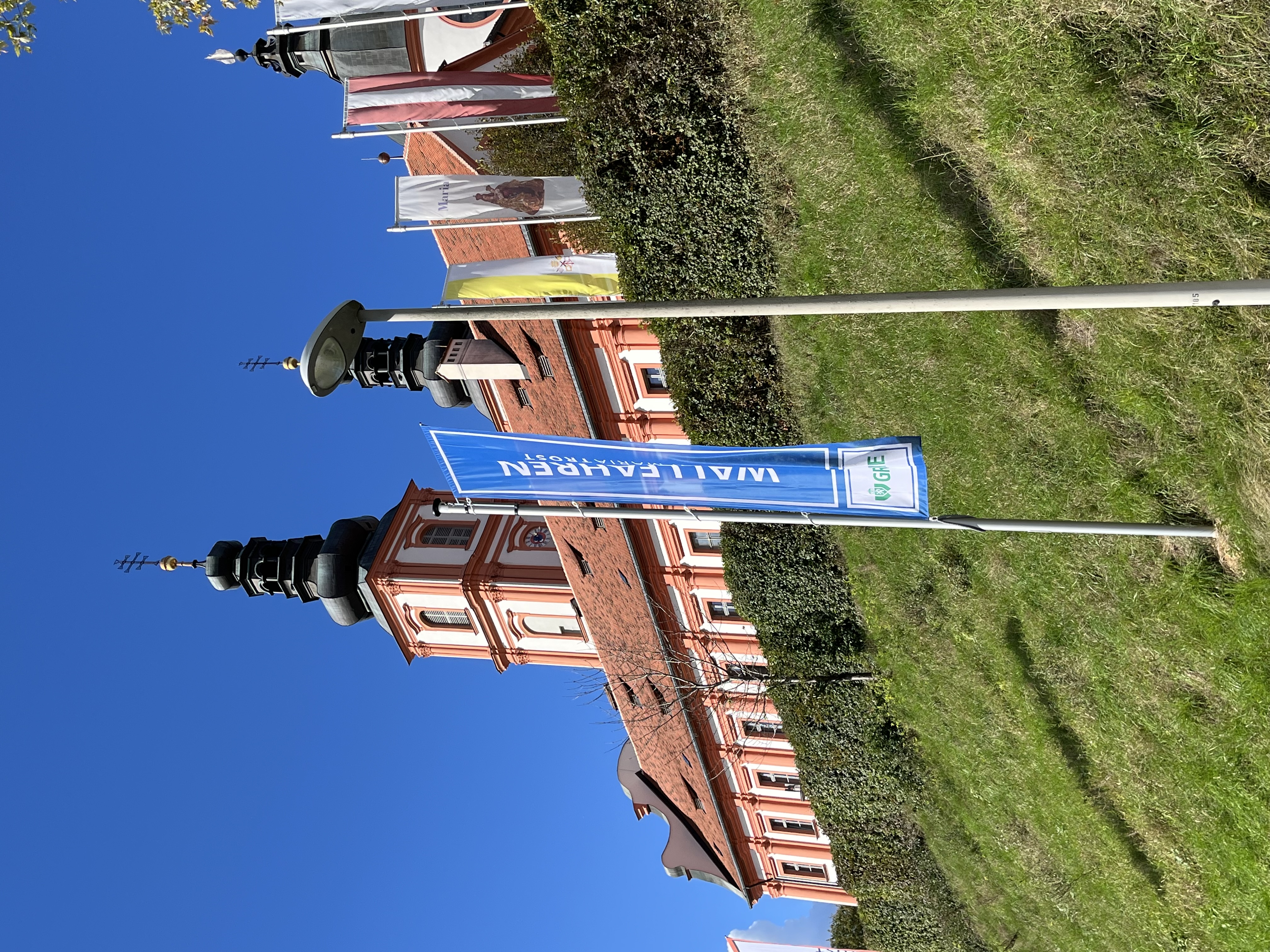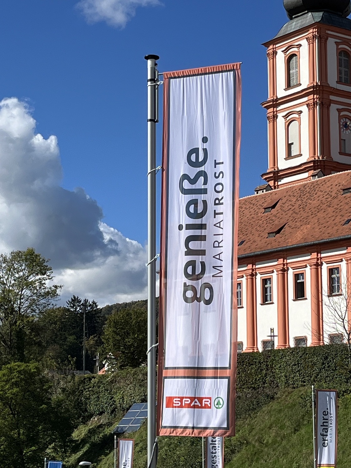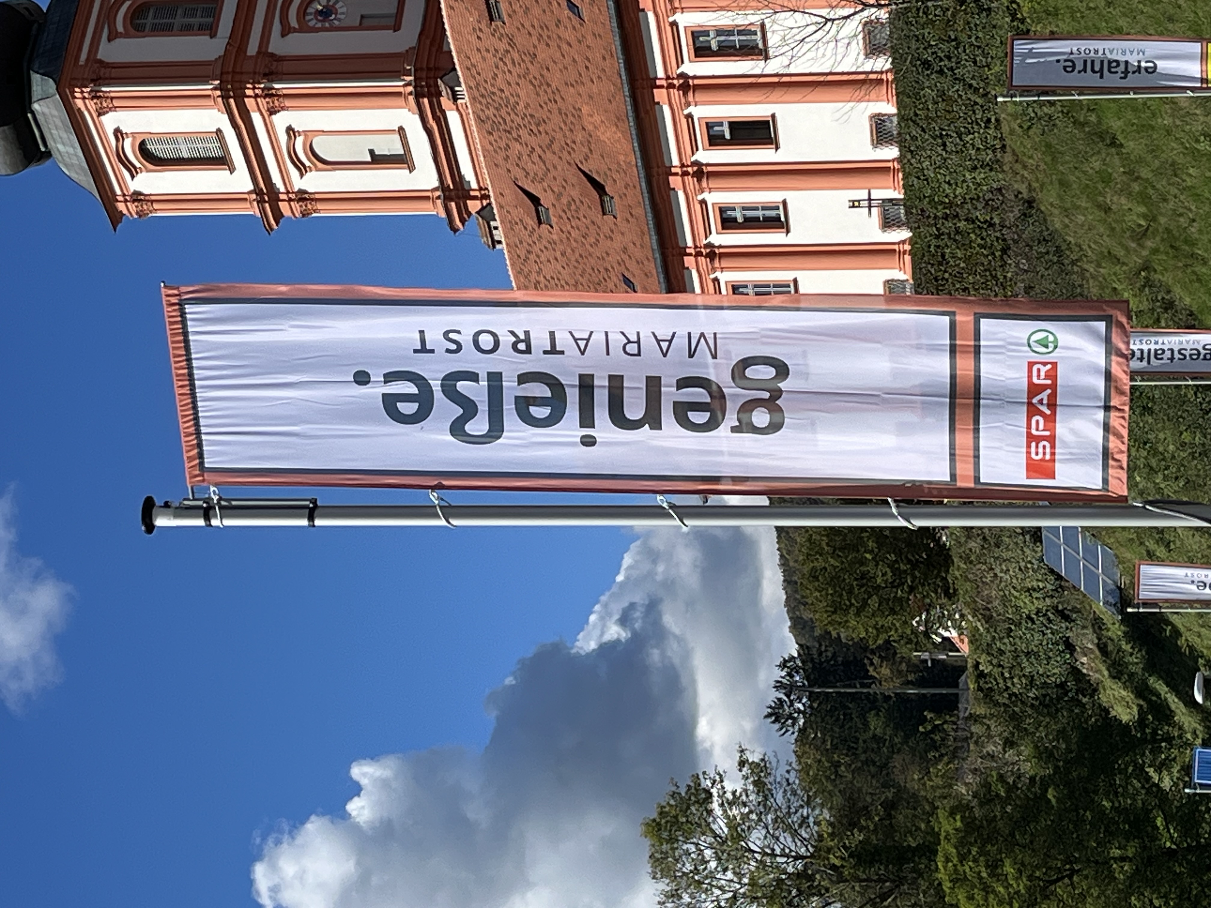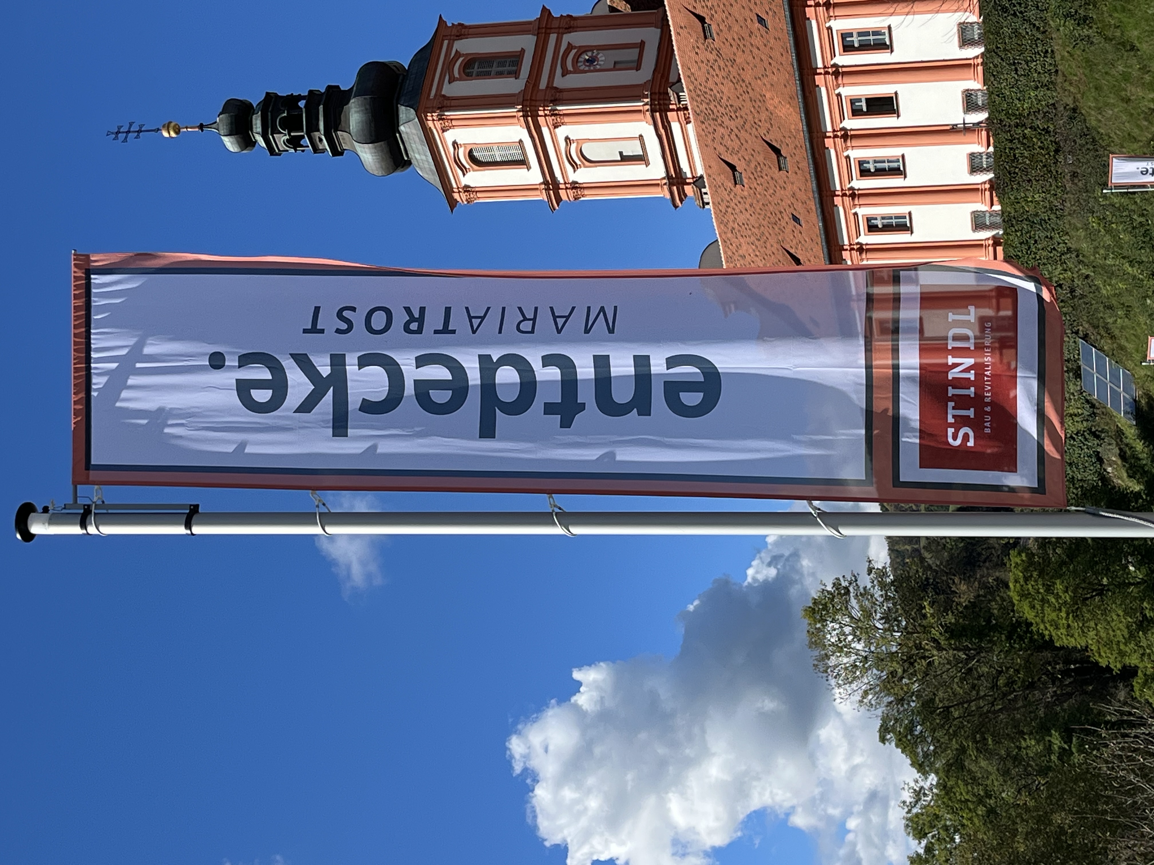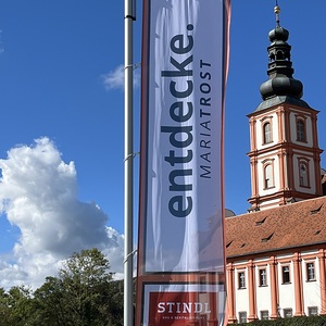 Mit einem Gedankenimpuls laden die Fahnen die Besuchenden zu einem vielfältigen Erleben von MARIATROST ein.