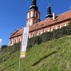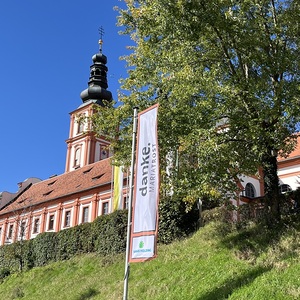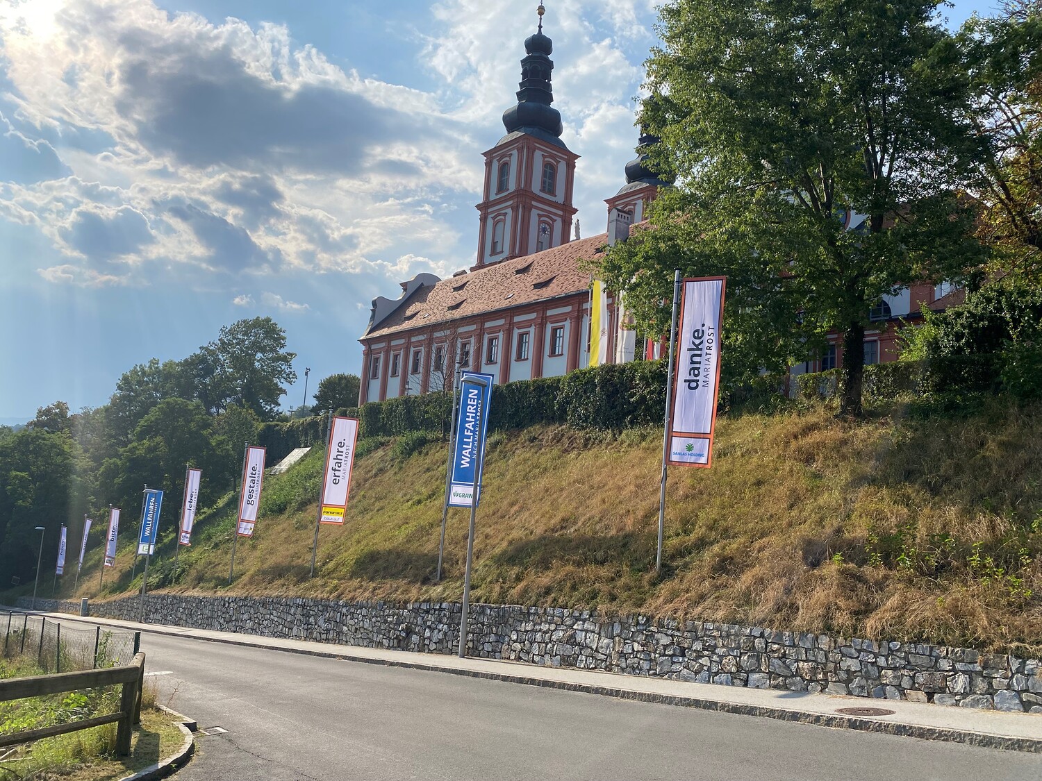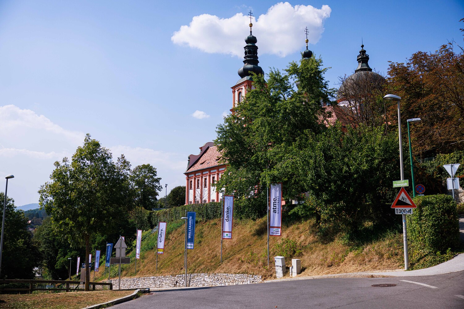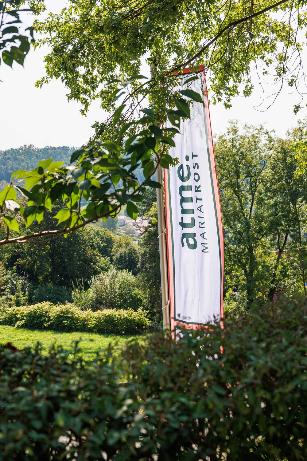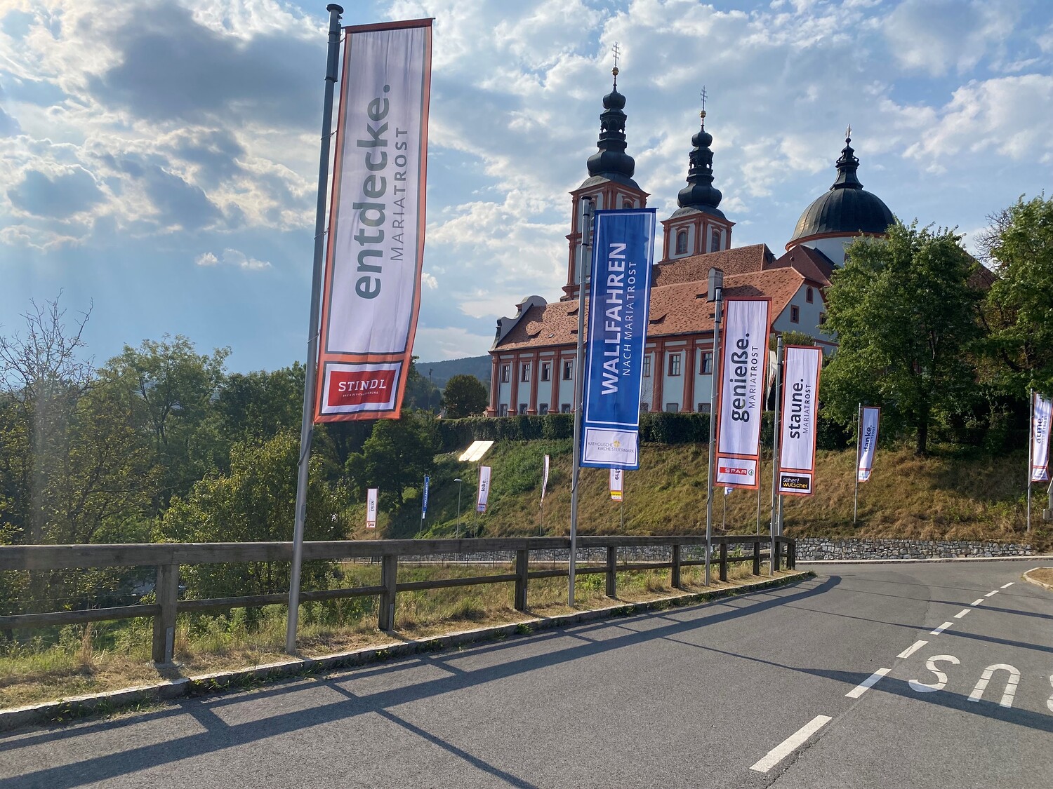 Mit einem Gedankenimpuls laden die Fahnen die Besuchenden zu einem vielfältigen Erleben von MARIATROST ein.