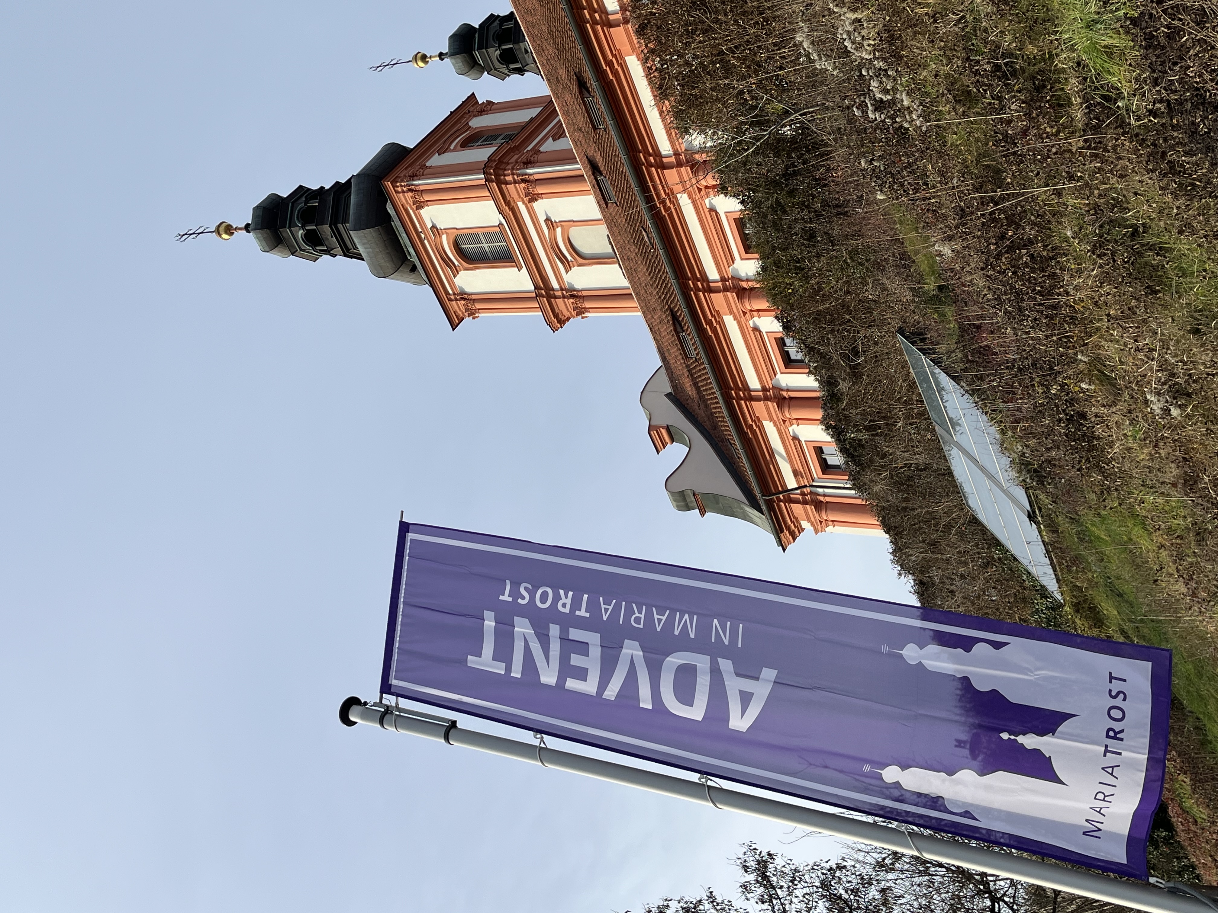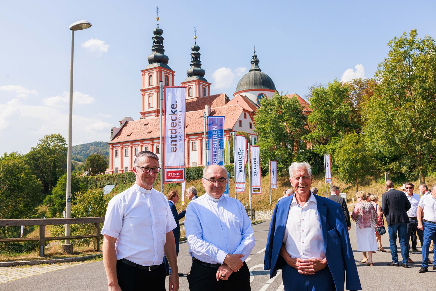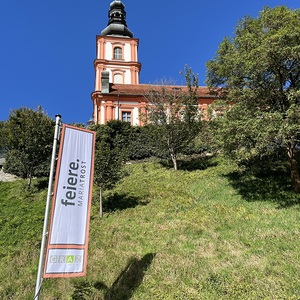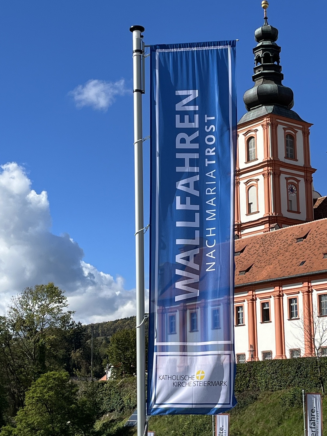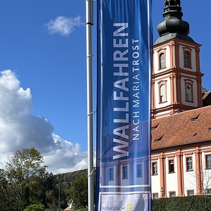 Da flattert etwa: „entdecke MARIATROST“, „gestalte MARIATROST“,  genieße MARIATROST“. – Im Rahmen einer Feier mit Sponsoren, Pfarraktiven und Freunden segnete Diözesanbischof Wilhelm Krautwaschl die Fahnen und wünschte viel Gelingen für die weiteren Schritte des für die steirische Kirche wichtigen Projektes.