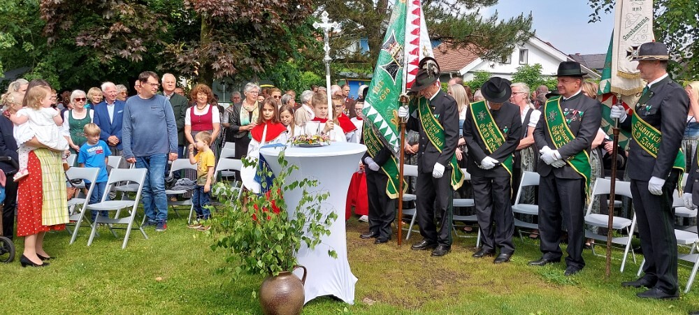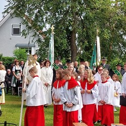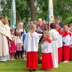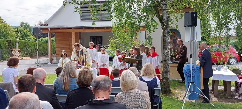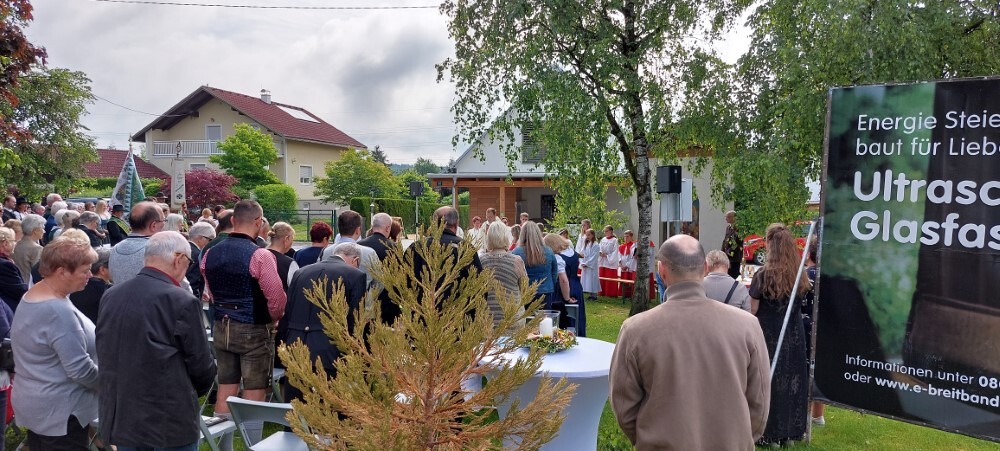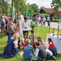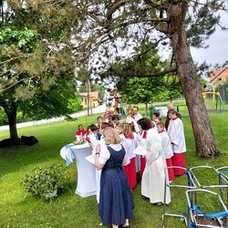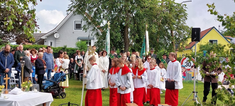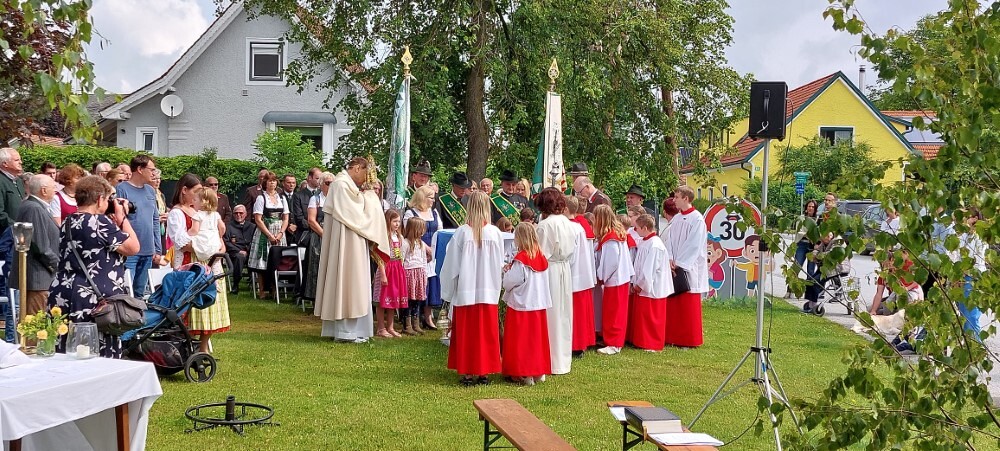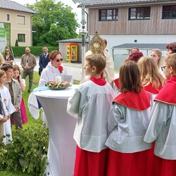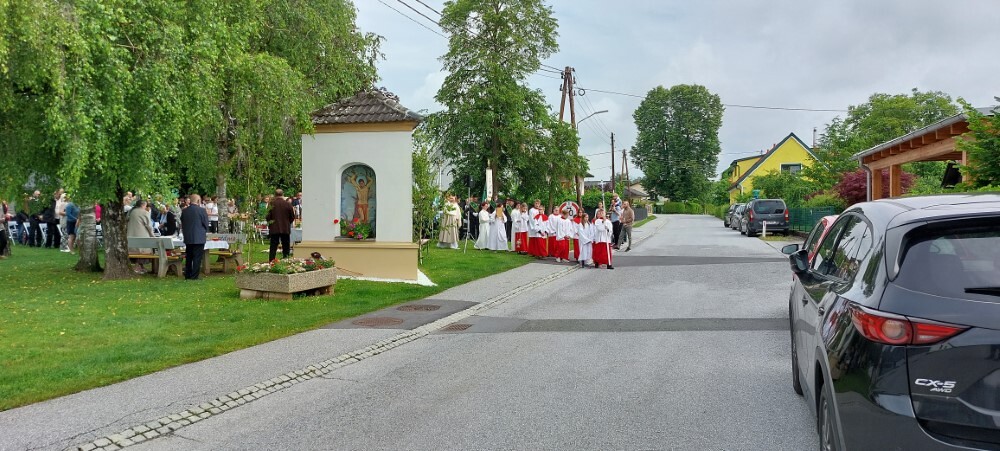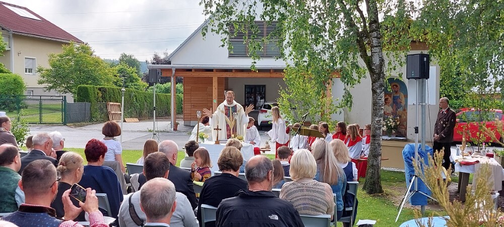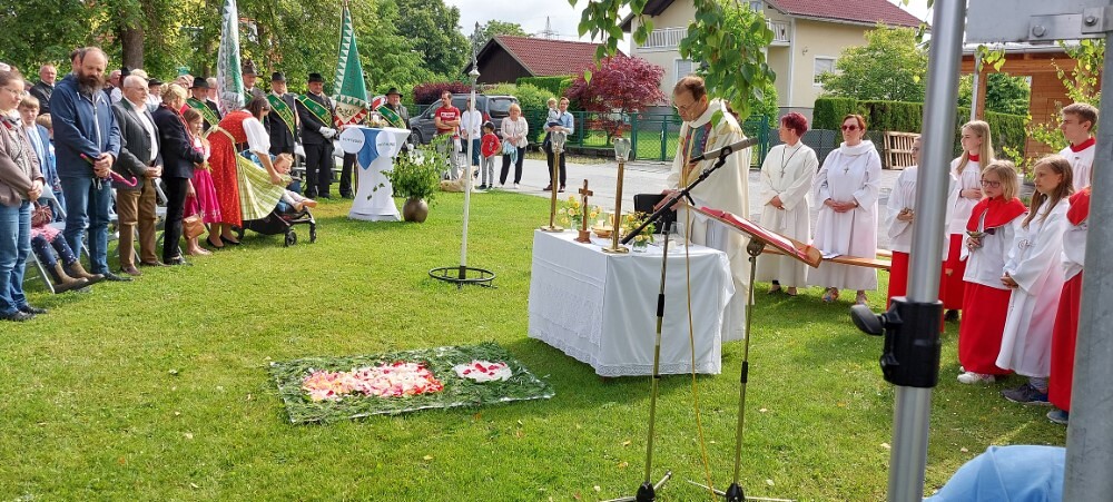 Im Anschluss an die Hl. Messe, zelebriert von Vikar Gerhard Hatzmann und begleitet von Kantorin, Lektoren und liturgischen Diensten beider Pfarren, fand eine Andacht bei den vier Stationen am Dorfplatz statt. Für die kleine Prozession waren vier Brottische als Altäre gerichtet, als Sinnbild für die vier Himmelsrichtungen und dafür, dass Christus der Heiland der ganzen Welt ist. Im gemeinsamen Liedruf "Brot des Lebens" zogen die liturgischen Dienste und die Kinder stellvertretend für das Volk Gottes zu den vier Altären: Brot der Liebe – Brot der Versöhnung – Brot des Friedens – Brot der Hoffnung. Zum Abschluss erteilte Vikar Hatzmann den Eucharistischen Segen, verbunden mit der Einladung, das Allerheiligste gemeinsam zur Kirche zu begleiten. Die Feier schloss mit dem gemeinsam gesungenen "Te Deum" ab. Zu den Feierlichkeiten waren auch die Vereine wie Feuerwehr und ÖKB eingeladen.
